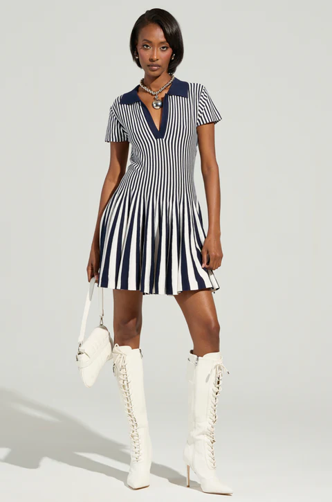 ALINA PLEATED KNIT FIT AND FLARE MINI DRESS IN NAVY